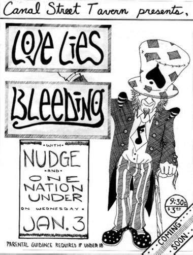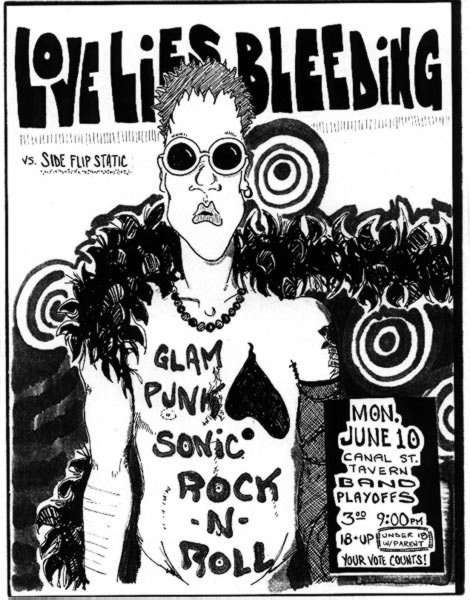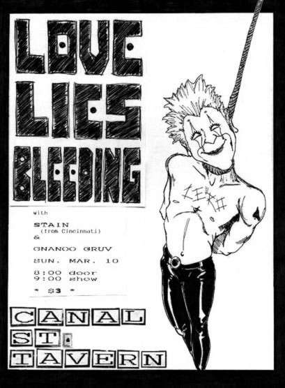 "LOVE LIES BLEEDING wasn't together very long but the glam-punk trio managed make some people take notice during its existence. The band released a split cassette with Nostromo on the Psionic label and a 10-song cassette, Under the Gloss, within days of each other. Things were looking bright when suddenly everything fell apart. Within weeks Love Lies Bleeding had called it quits amid rumors of fistfights and missing eye shadow. Singer/guitarist Steven Gullett has formed the new band Hanging Party for one show only. You can see Gullett and friends at Canal Street later this month opening up for Too Much Joy and The Jezebelles. Look for bassist GeorgeBradley and drummer Jimmy Magnuson to continue on in some altered form. "